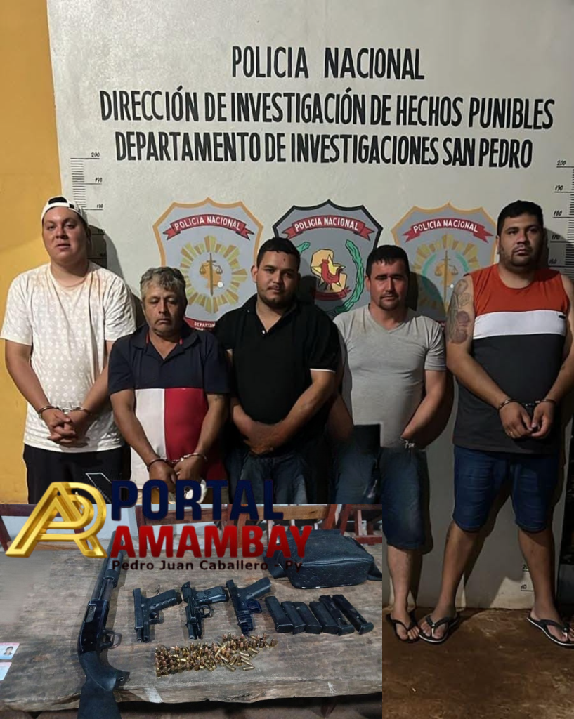 Durante el procedimiento fueron capturadas cinco personas, entre ellas un suboficial primero activo de la Policía Nacional, identificado como Silvio Ramón León Saucedo, dependiente de la Dirección de Policía de Amambay. Los demás aprehendidos fueron Casildo Martínez Venialgo (51), con antecedentes penales; Edgar Julián Duarte Benítez (25); y Luis Antonio Roble (23), quien cuenta con tres órdenes de captura por homicidio doloso y exposición al peligro.