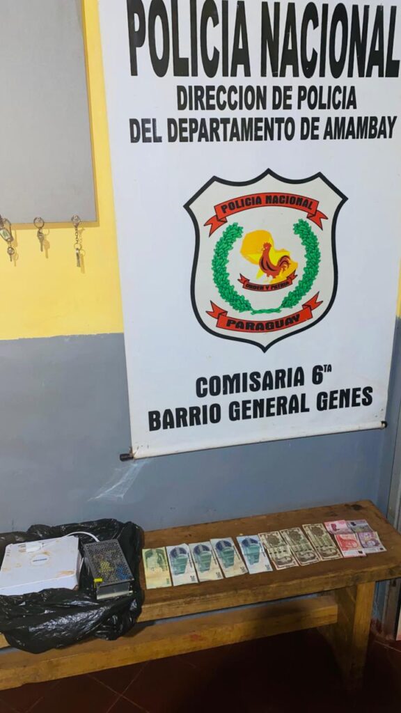 Posteriormente, al verificar la bolsa descartada, los policías constataron que en su interior se encontraban objetos denunciados como hurtados, procediéndose a la recuperación de un aparato DVR marca Hikvision, modelo DS-7108HGHI-M1, una fuente conversora de voltaje marca Songriu, modelo S-180-12, y la suma de 217.000 guaraníes en efectivo.