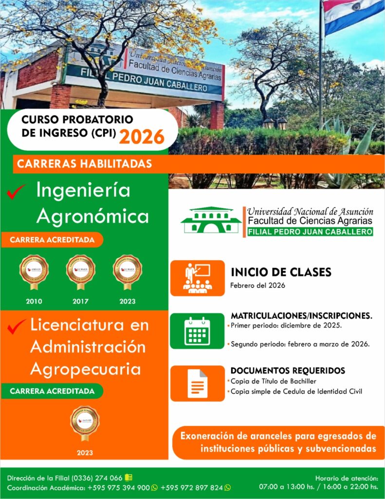 Pedro Juan Caballero. – La Facultad de Ciencias Agrarias de la Universidad Nacional de Asunción (UNA), filial Pedro Juan Caballero, anunció la apertura oficial de inscripciones para el Curso Probatorio de Ingreso (CPI) 2026, destinado a jóvenes que aspiran a formarse profesionalmente en el ámbito agropecuario, un sector clave para el desarrollo económico y sostenible del país.